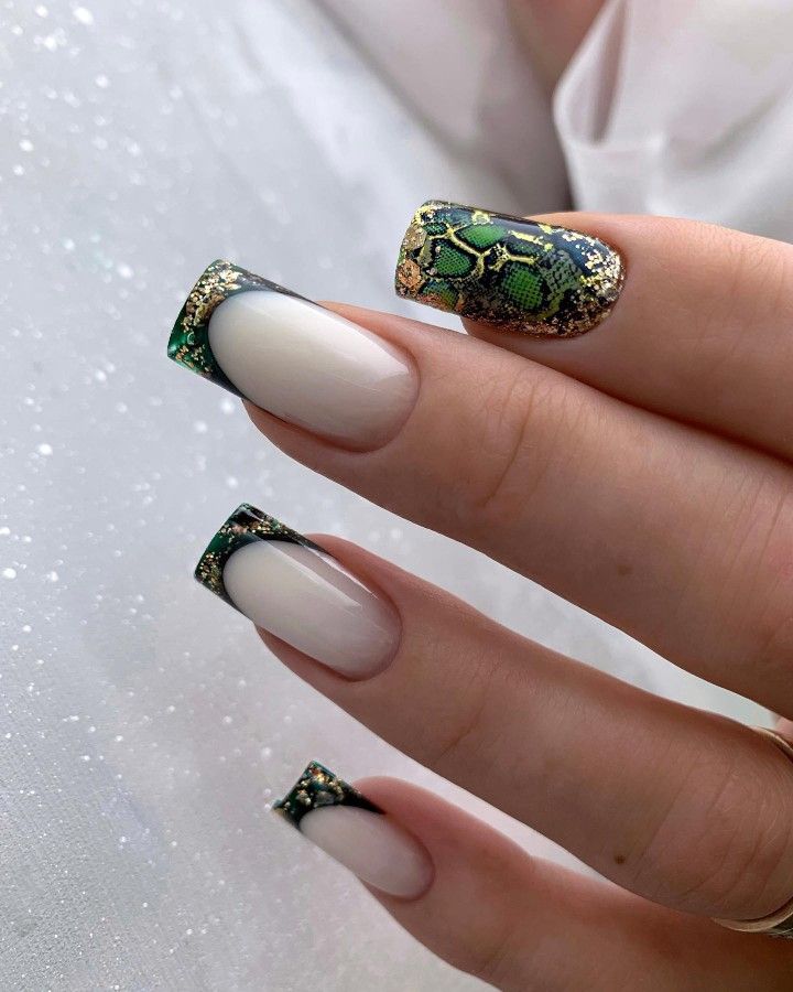 Reimagine the classic French manicure with snake-print tips and a subtle gradient. The combination of green, gold, and black gives a luxurious and edgy appeal, perfect for 2025 winter art designs.
