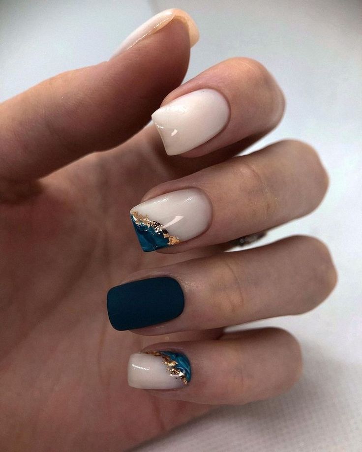 This chic art design for 2025 combines navy blue marble accents with gold leaf details, giving a luxurious yet serene vibe. Perfect for autumn or winter, this design embodies understated elegance.