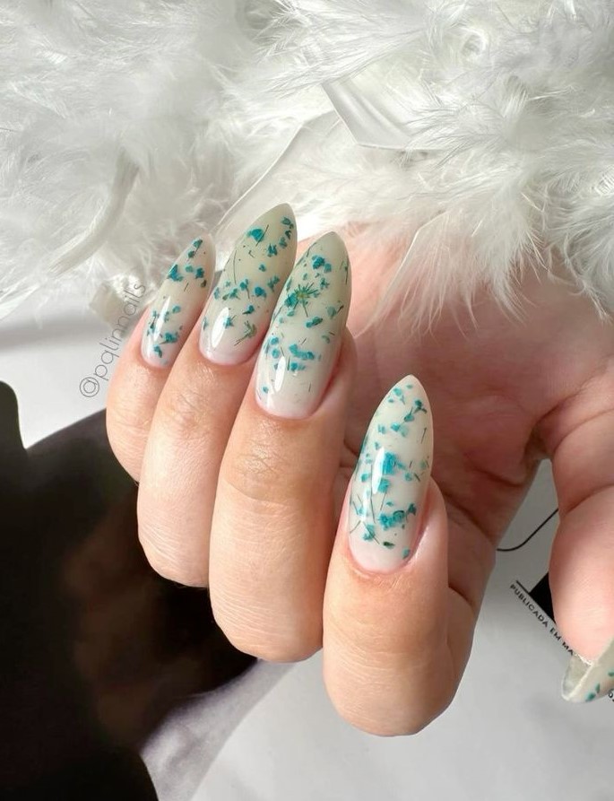 Elegance takes center stage with these cute floral designs, blending natural elements with translucent nails. Subtle blue floral patterns sit delicately against a nude background, making them perfect for spring 2025. The almond shape enhances their femininity and sophistication.