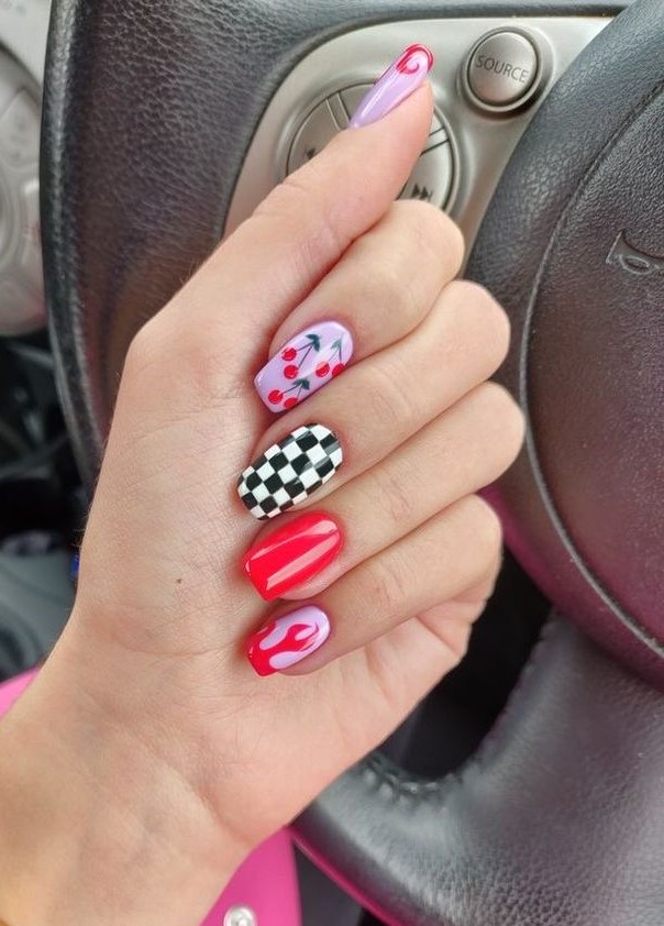 Cherry motifs, checkerboard patterns, and vibrant flames make this nail art perfect for anyone who loves playful and eclectic styles. This design shines for summer 2025 art ideas, giving off a youthful, vibrant energy.