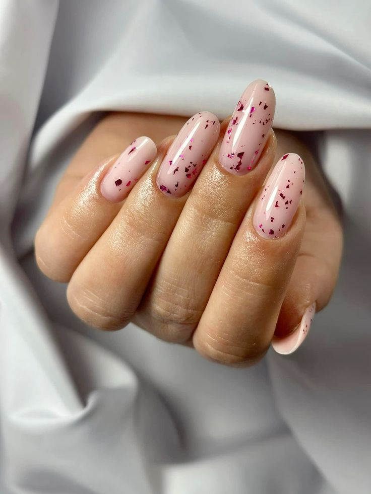 These nails are a perfect representation of 2025 spring short nail trends. Soft pink tones provide a delicate base, while scattered red foil accents add a playful yet elegant flair. This look is a fantastic choice for Diwali celebrations or romantic spring outings. The short almond shape makes it practical and stylish, blending effortlessly with floral prints or pastel outfits.