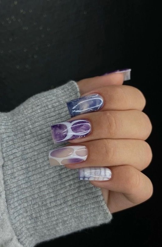 If you’re seeking bold art designs that make a statement, these abstract purple marble nails are the answer. Swirls of lavender and violet blend seamlessly with geometric white overlays to create a stunning, futuristic look. This design screams 2025 winter sophistication, ideal for formal events or New Year’s Eve. Pair these nails with a silver cocktail dress or black velvet for maximum impact. Summer 2025 purple nails have never looked this artistic and unique.