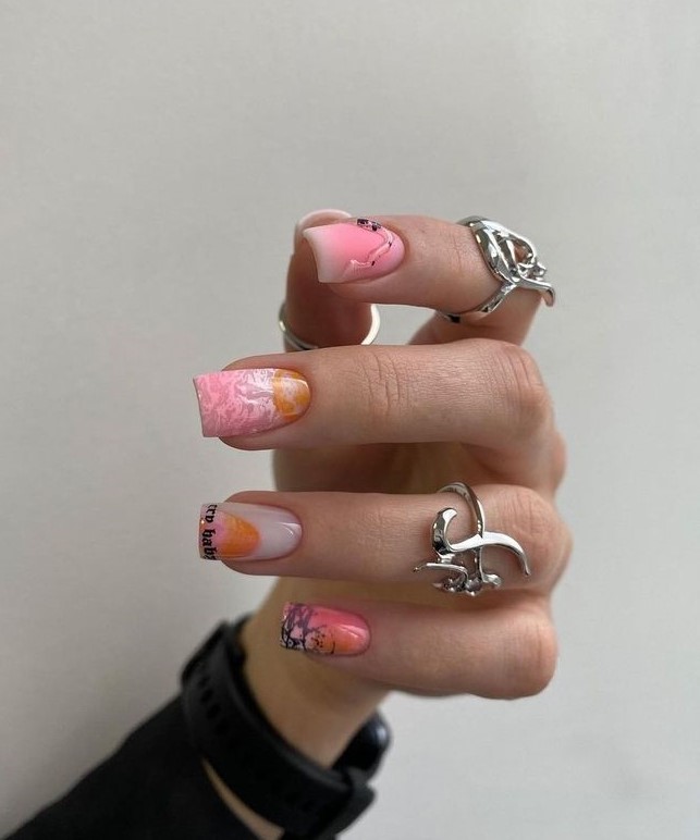 Bold yet simple, this 2025 art design features pink hues marbled with orange tones, creating a lively, dynamic effect. The short square nails add practicality while maintaining a chic edge, ideal for day-to-night transitions.