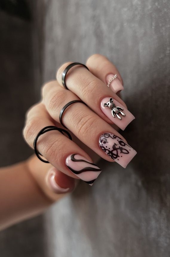 Muted pink nails with black gothic accents, including edgy bear charms, make this design perfect for alternative fashion enthusiasts. The art design blends playfulness with a dark aesthetic, suitable for November 2025.