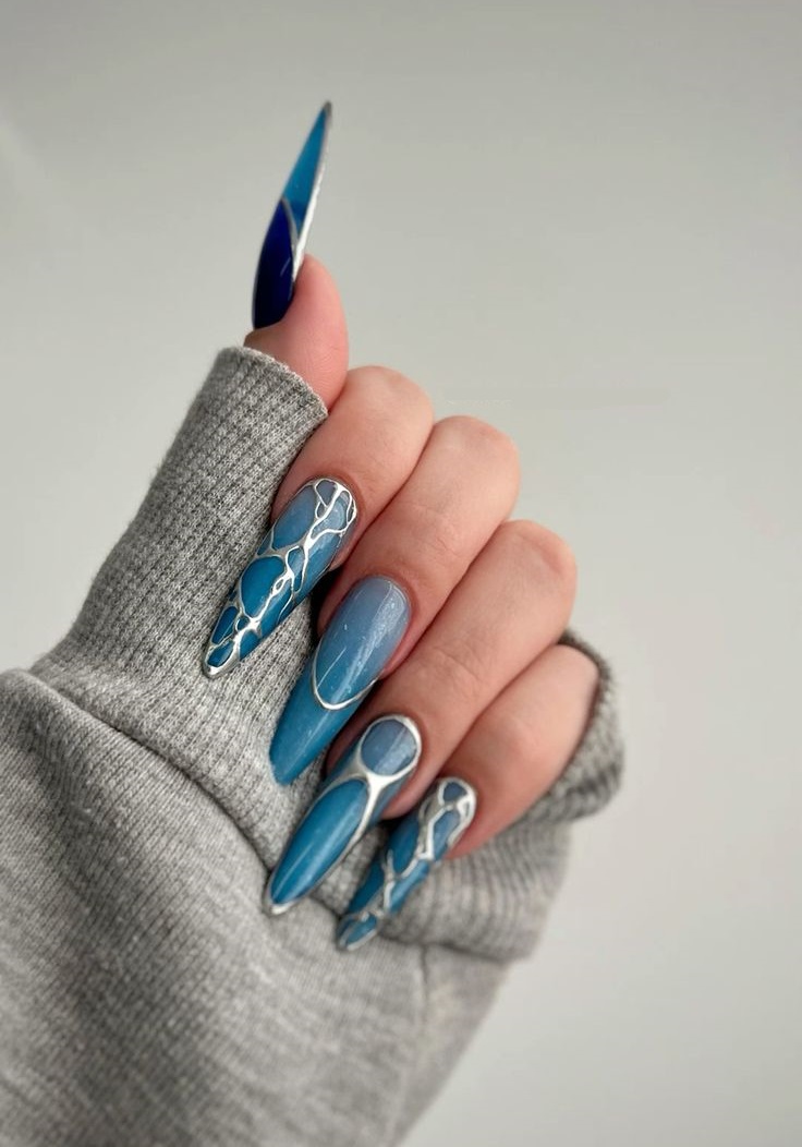 Channel the serene vibes of the ocean with this art design featuring deep blue gradients outlined in metallic silver. The elongated almond shape enhances its elegance, making it ideal for summer 2025 purple inspirations.