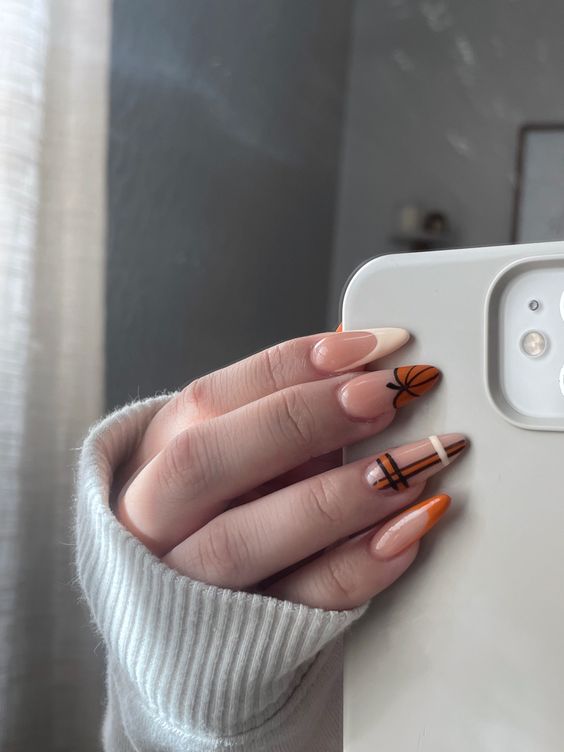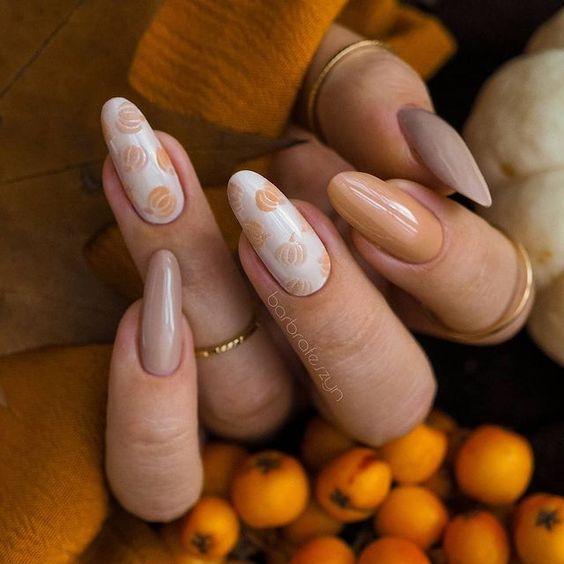 Celebrate the essence of fall with these nails, featuring white and orange leaves against a muted background. The festive design is reminiscent of pumpkin patches and autumn harvests, providing a playful yet stylish nod to the season’s traditions.