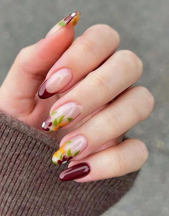 These nails offer a deep, glossy maroon shade interspersed with a muted nude and adorned with golden accents. The luxurious colors and subtle sparkle are perfect for evening wear, lending a touch of glamour to any fall ensemble.