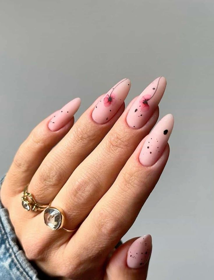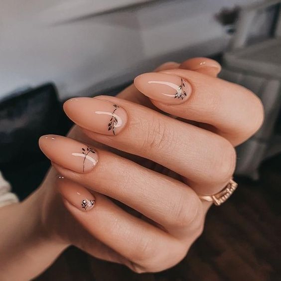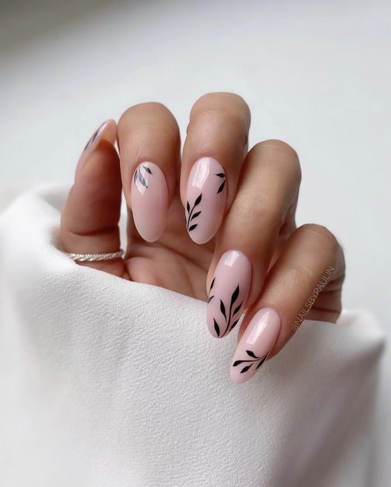 Featuring sleek black botanical designs over a light pink base, these nails are the epitome of elegance. The contrast between the delicate flora and the soft background makes a stunning visual statement, ideal for those who prefer a more refined and artistic nail design.