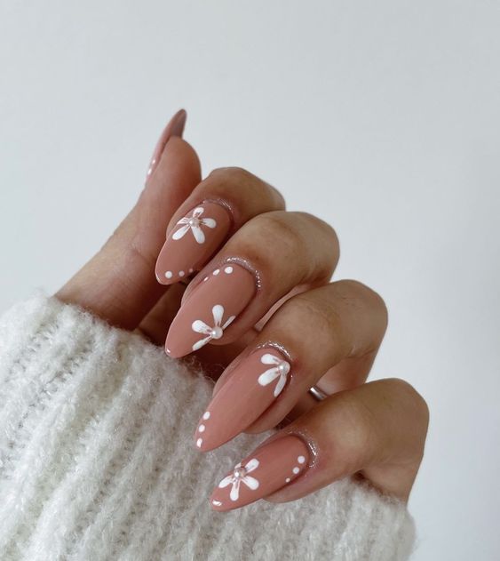 These nails are adorned with dainty white daisies set against a pale pink backdrop, offering a fresh and floral look that’s right in line with the softer side of fall. The tiny flowers and polka dot accents are playful yet sophisticated, making this style suitable for both professional environments and weekend brunches.
