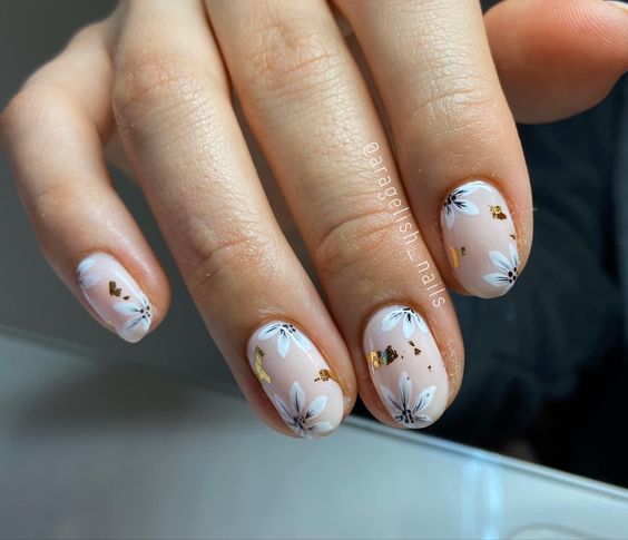 Charming and delicate, these nails feature white floral designs over a soft pink base. Accented with subtle gold flakes, the pattern is sophisticated and stylish, suitable for weddings or special events where a touch of floral elegance is desired.