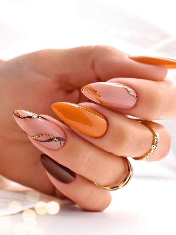 Dive into the sparkle of the season with these stunningly glamorous nails. The design features a rich, shimmering bronze base with swirling white patterns that create a dramatic, almost marbled effect. This style is perfect for adding a touch of luxury to any autumn evening event. Its reflective quality catches the light beautifully, ensuring your nails don’t just complement your outfit but become a standout accessory.