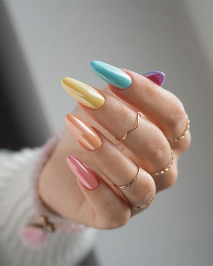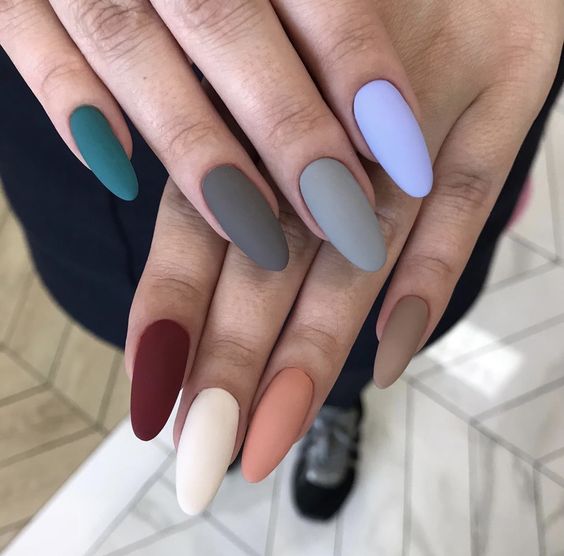 This design showcases a beautiful array of pastel shades, from teal to lavender to peach, all lined up in a pleasing array. Each nail offers a different hue, making this style vibrant and colorful, a fantastic choice for those looking to make a playful yet subtle statement this fall.