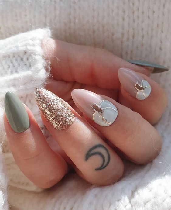 Reflecting fall’s natural palette, these nails feature a gradient from earthy beige to soft moss green, encapsulating the season’s essence. This design pairs excellently with neutral or olive green attire, making it a versatile choice for both everyday wear and special autumnal gatherings.