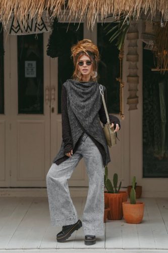 This outfit is all about understated elegance with a hint of boho-chic. A black form-fitting dress serves as a canvas for the ornate floral kimono, which introduces a burst of autumn colors to the ensemble. This look is perfect for a fall birthday party or an evening event, where the vibrant patterns in the kimono can truly shine. It’s a beautiful blend of comfort and style, making it a staple for those cooler evenings.