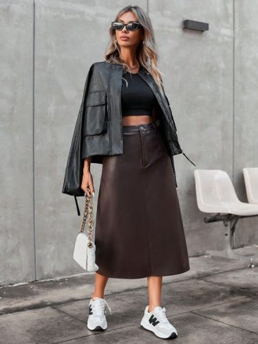 Here, the look is all about urban edge with a feminine twist. A leather jacket draped over a cropped top and paired with a high-waist leather skirt showcases a strong yet chic aesthetic. The outfit is accessorized with a white handbag and casual sneakers, perfect for those who prefer comfort without compromising on style. This is an excellent choice for those seeking clean girl fall outfits that are easy to wear and stylish.