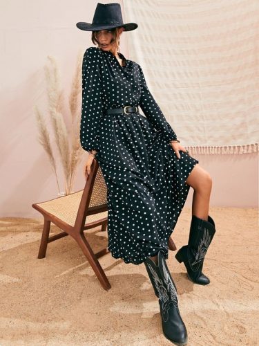This polka dot dress accented with a cowboy hat and matching boots brings a playful yet refined element to fall dressing. The flowy fabric and long sleeves are practical for cooler weather, while the belt cinches the waist, enhancing the silhouette. This outfit is perfect for a birthday celebration or a chic outdoor event, offering both comfort and style.
