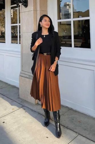 This outfit marries sophistication with a touch of urban flair. A pleated, caramel-colored skirt paired with a structured black blazer offers a smart-casual look suitable for the office or an evening out. Complete this outfit with black leather boots and a simple black top to keep it sleek and stylish.