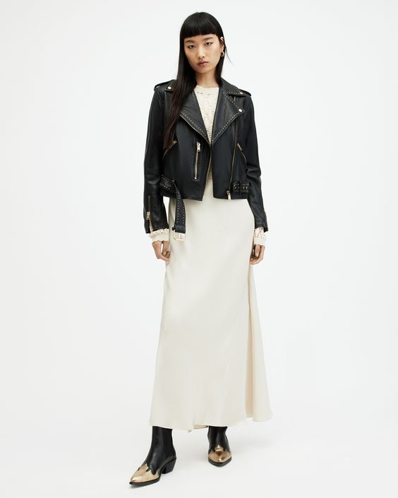 This modern monochrome outfit pairs a sharp black leather jacket with a long, flowing white skirt and contrasting black ankle boots. It’s a striking look that plays with texture and length, ideal for fashion-forward individuals who enjoy a bit of edge in their style.