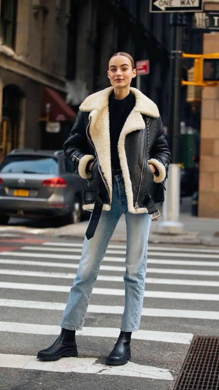 Blending comfort with city style, this outfit showcases a plush black and white jacket paired with a simple black top, classic blue jeans, and flat black boots. This look is ideal for a chilly day in the city, offering both warmth and a chic urban aesthetic.