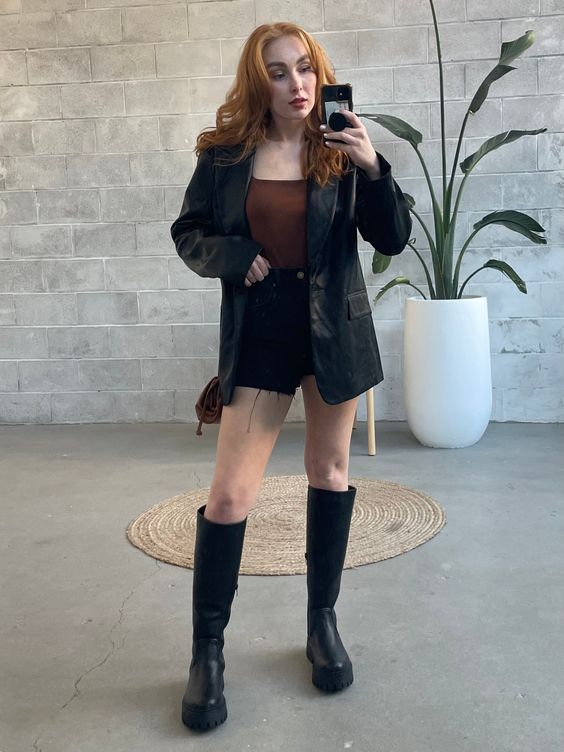Casual and comfortable, this look features a dark blazer paired with a high-waisted black mini skirt and chunky black boots. It’s perfect for a day of errands or a casual lunch, offering ease without sacrificing style.