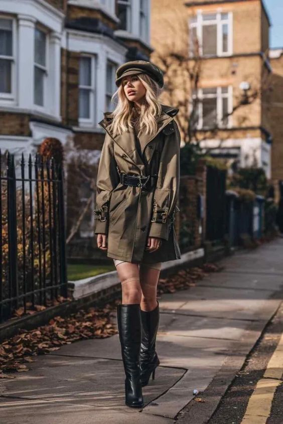 Showcasing a sophisticated fall look, this outfit features a classic trench coat paired with tall black leather boots and accessorized with a stylish cap. It’s the perfect blend of classic and modern elements, suitable for a range of fall activities from a walk in the park to a professional meeting.