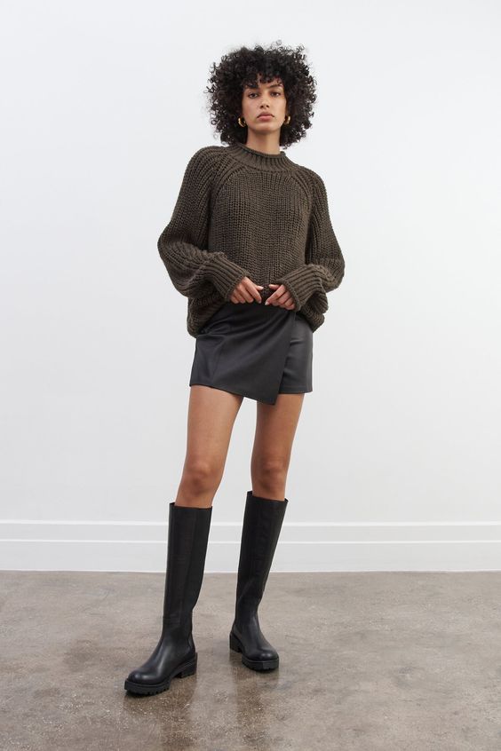 Combine comfort with edge by wearing chunky black boots with a bulky knit sweater and a mini skirt. This look is great for those chilly days when you want to feel cozy yet look effortlessly chic.