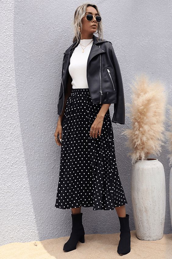 A playful approach to fall fashion, this outfit features chunky black boots and a polka dot skirt, topped with a stylish black jacket. It’s perfect for adding a little fun to your wardrobe while keeping things fashionable.
