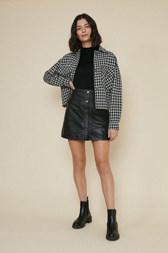 This look puts a modern twist on classic elements with a houndstooth jacket, black mini skirt, and ankle boots. It’s perfect for transitional weather, blending warmth with undeniable style.