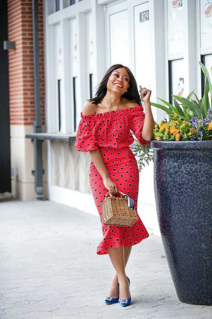 A happy burst of red with a playful polka dot print, this off-the-shoulder dress embodies trick or treat energy with a summer twist. The ruffled hemline and fitted silhouette create a fun, flirty vibe. Style with bold blue heels and a woven bag for an effortlessly chic daytime look.