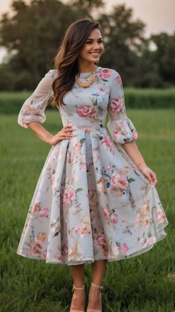 Taking inspiration from movie star glamour and indie aesthetics, this pastel floral midi dress with puffed sleeves is timelessly romantic. The fitted bodice and flowing skirt create a regal silhouette, making it perfect for garden weddings or drag-inspired events. Pair with soft curls and nude heels for an ultra-feminine look.