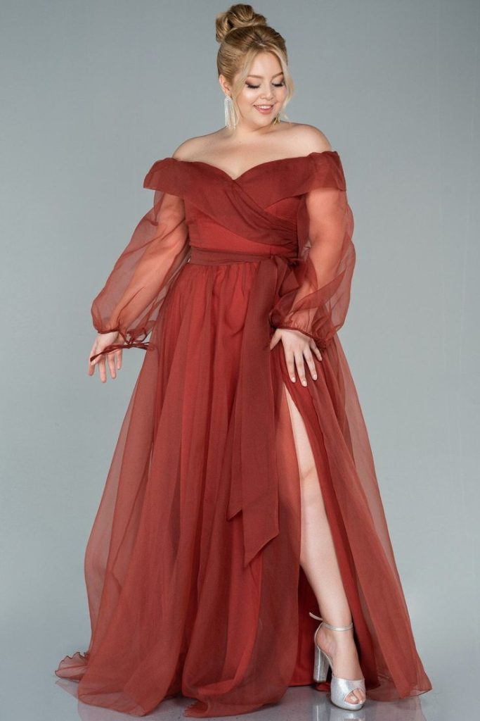 This flowing rust-colored gown is no VIP-only attire—it’s for every woman who wants to own the room. With off-the-shoulder draping, sheer sleeves, and a daring slit, it balances elegance and confidence. The deep, autumnal shade ties into hardcore punk drama and widow-like mystique. Pair it with statement earrings and silver stilettos for maximum impact.