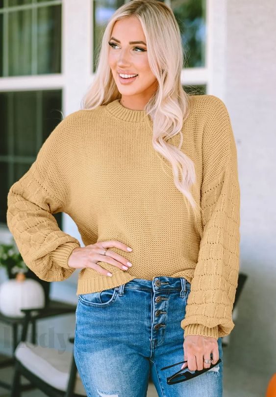 This mustard yellow sweater combines classic knitting techniques with a modern cut. The ribbed detailing along the arms adds texture and depth to the design, while the solid color makes it a versatile piece for pairing with both jeans and skirts. This sweater is an excellent choice for those looking to add a splash of color to their fall wardrobe without compromising on comfort.