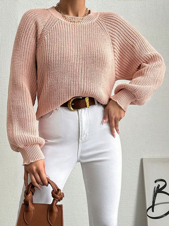 This soft pink pullover offers a gentle yet stylish option for those cooler fall days. Its loose weave and puffy sleeves add a modern twist to the traditional sweater, making it a standout piece in any wardrobe. Paired with classic white jeans and accented with a bold brown belt, this outfit is perfect for a casual brunch or a day out shopping. The combination of pastel pink with crisp white brings a fresh, cute aesthetic that’s hard to overlook.