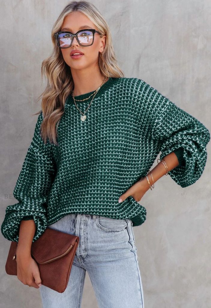 Fall fashion isn’t complete without a touch of subtle elegance. This soft green crochet pullover meshes beautifully with the changing leaves, providing a cozy yet elegant look. Its textured pattern and relaxed fit make it an excellent choice for those chilly early mornings or relaxed evenings. Paired with dark jeans, it’s an outfit that speaks to understated elegance suitable for both work and weekend outings.