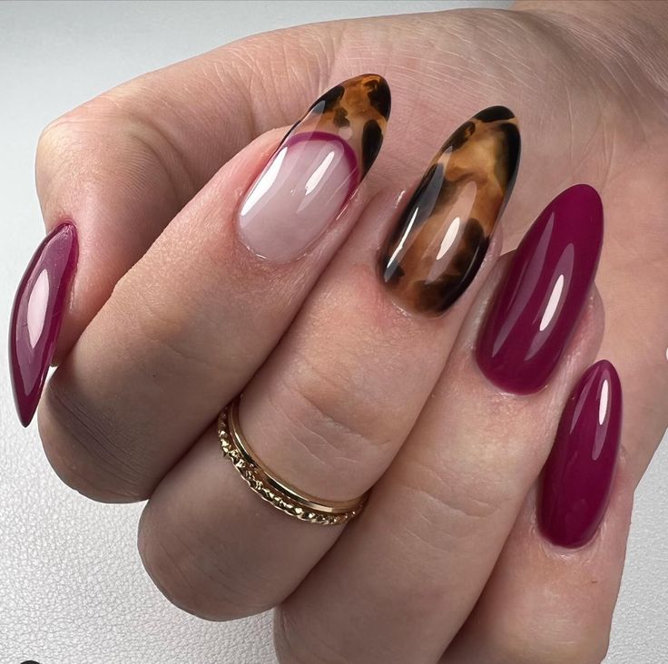 This edgy design features rich burgundy nails complemented by a tortoise-shell pattern, adding depth and dimension. The almond shape enhances the chic factor, making this look ideal for spring evening outings or professional settings.