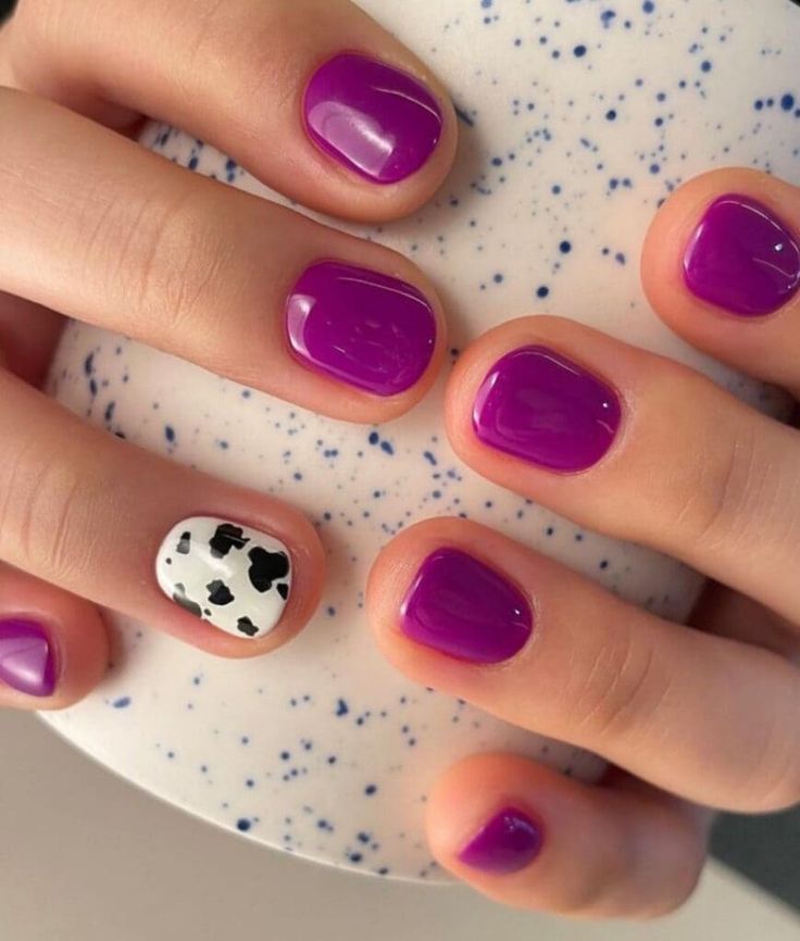 This vibrant purple manicure is an excellent choice for those who love a bold and playful look. The cow-print accent nail adds a quirky yet stylish touch to the design, making it perfect for a fun spring outing. The short nail length ensures practicality while keeping the look chic and trendy.