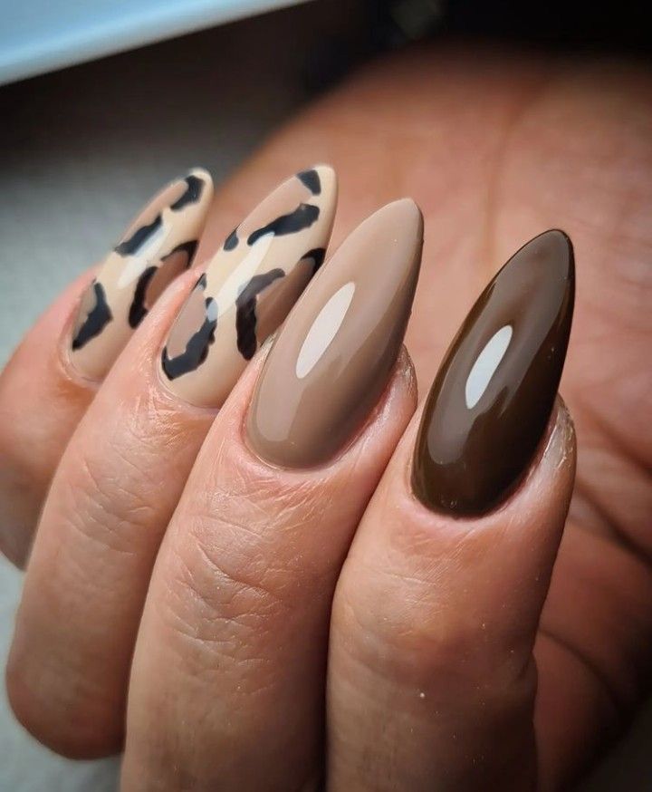 This sophisticated design features a mix of earthy neutral tones and bold animal print accents. The almond nail shape adds elegance, making it ideal for women seeking a refined yet trendy style. The muted browns and blacks create a timeless look that transitions seamlessly from day to night.