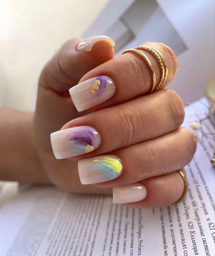This pastel swirl design is a delicate yet creative option for 2025 spring nail trends. The combination of lilac, yellow, and pink hues with gold accents makes it perfect for women seeking a subtle yet artistic look. The square nail shape enhances the elegance of this design.