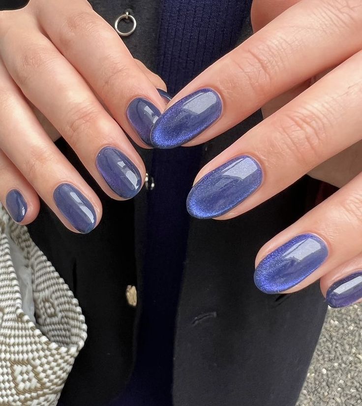 This shimmering midnight blue design combines elegance with a hint of drama. The oval nail shape enhances the overall sophistication, while the subtle shimmer catches the light beautifully. This look is perfect for evening events or adding a touch of glamour to your everyday style.