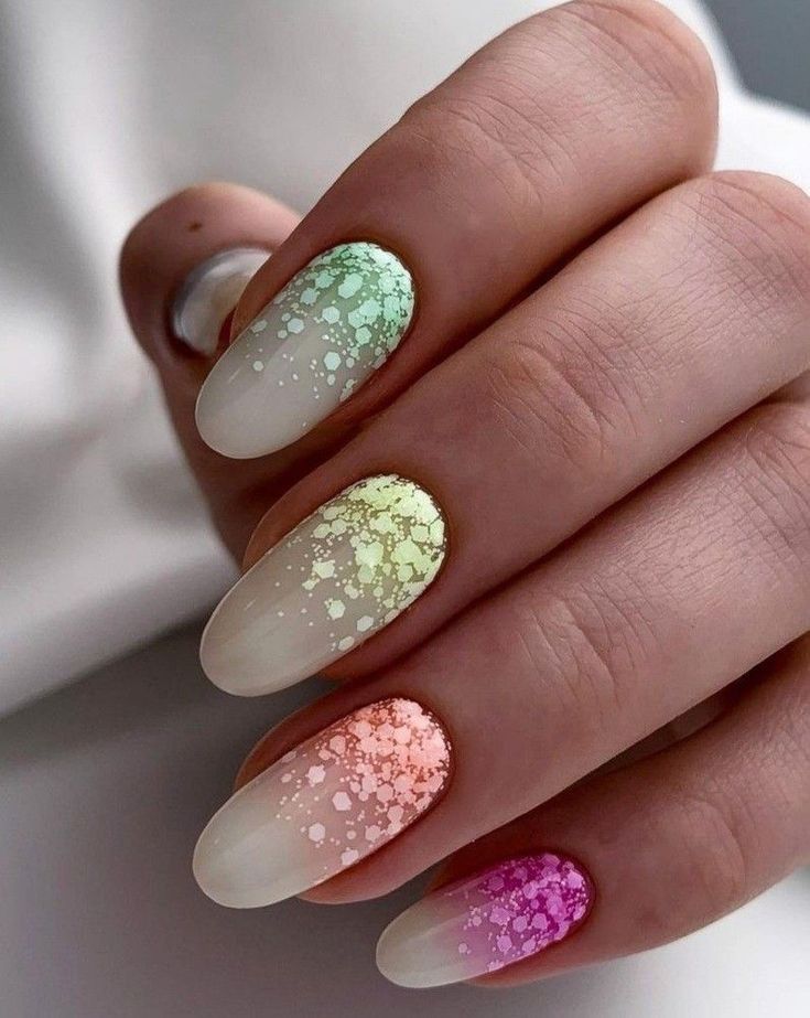 For a playful twist on 2025 nail designs, this speckled look combines pastel gradients with abstract patterns. The speckles in green, orange, and pink add a unique, eye-catching charm, perfect for women who want to stand out. Best suited for oval-shaped nails, this design works beautifully with a matte finish for a textured appearance.