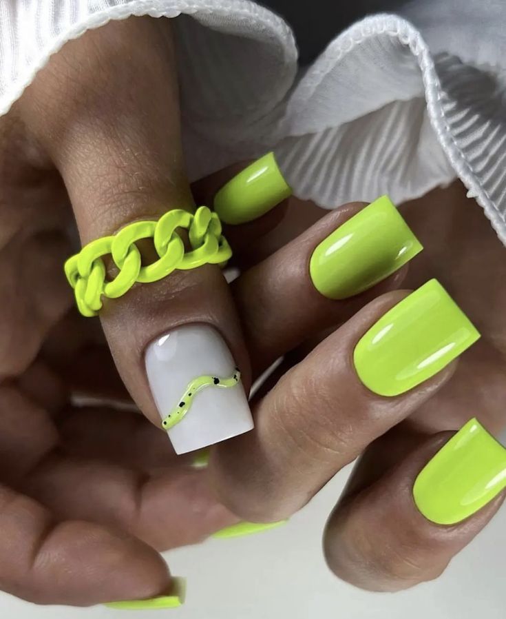 Make a statement this spring with bright neon yellow square nails. This electrifying shade adds a bold pop of color, perfect for women looking to spice up their wardrobe. The accent nail features a playful French-inspired swirl, merging the french tip trend with modern art.