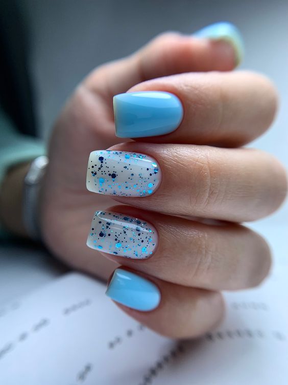 Blue never goes out of style, especially when paired with fun splatter art. This chic gel nail design features a clean blue base with splashes of white and navy, making it perfect for everyday wear. The square nail shape gives it a sleek, modern edge.