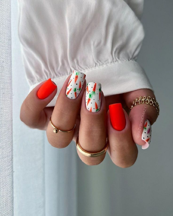For a quirky spring twist, these nails feature a mix of bold orange and carrot-themed designs. The cute patterns, coupled with a vibrant orange base, are perfect for embracing the season’s playful energy.