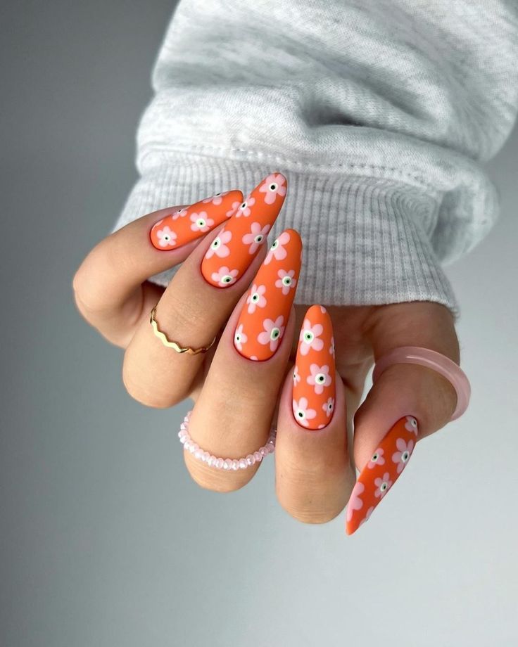 Nothing says spring like floral designs. These long acrylic nails feature an adorable daisy pattern against a bright orange backdrop, blending bold and sweet elements. The almond shape adds a touch of elegance to this playful design.