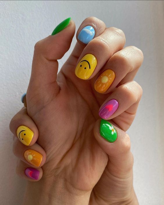 These vibrant nails are all about positivity, featuring a mix of smiley faces, rainbows, and sunny vibes. Perfect for shorter nail lengths, this look is ideal for women who want a fun and cute design without compromising on comfort.