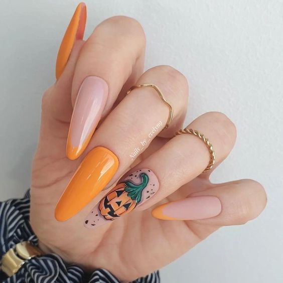 Perfect for the festive season, this design incorporates playful elements like pumpkin illustrations on a nude base, balanced with bold orange tips. It’s a whimsical take on the pumpkin spice theme, offering a delightful nod to Halloween and Thanksgiving festivities. This design is a conversation starter and adds a joyful spirit to any ensemble.