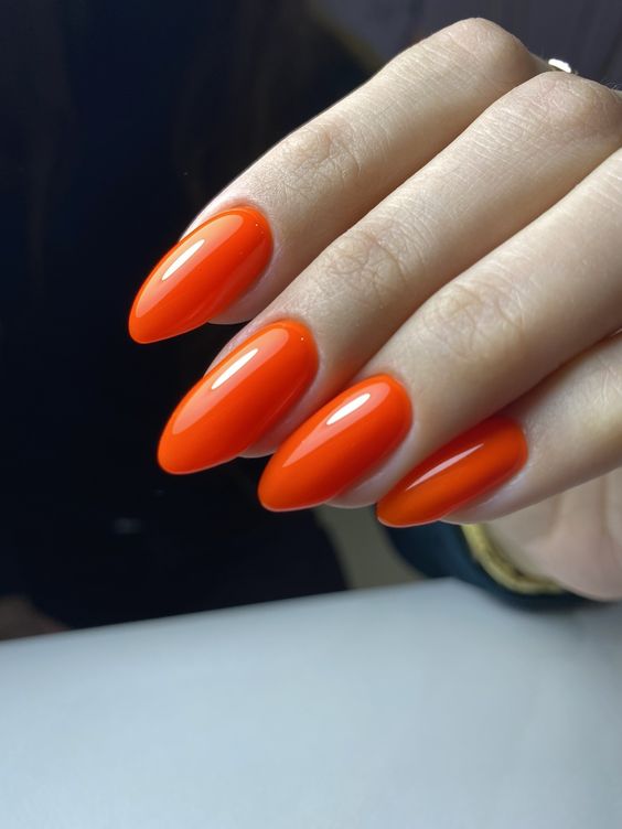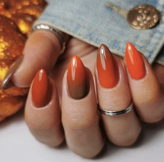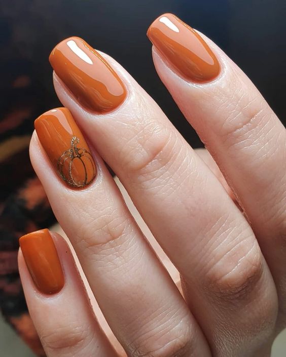 For those who prefer a subtler nod to the season, these sleek almond-shaped nails in a solid pumpkin spice hue are a stylish choice. The almond shape is not only trendy but also lends a sense of sophistication and modernity to the design. These nails are ideal for professionals who enjoy seasonal styles but need to maintain a polished appearance.