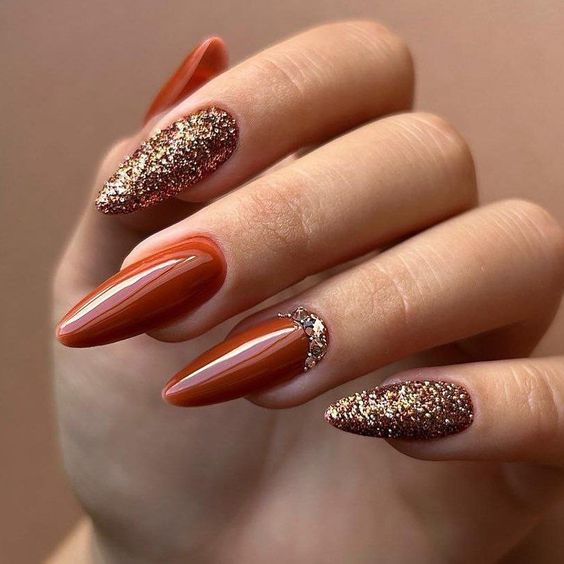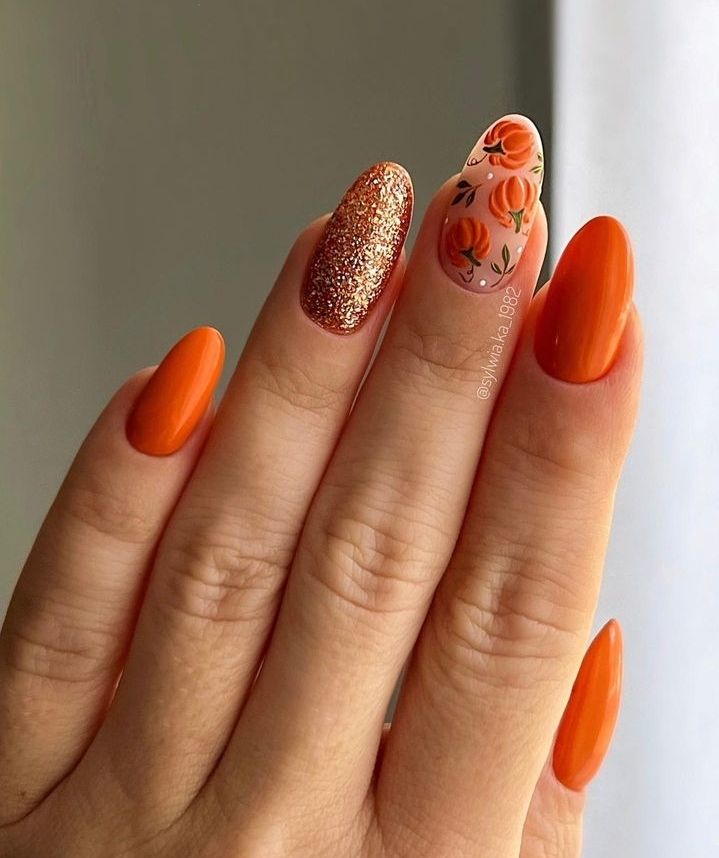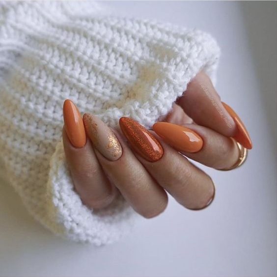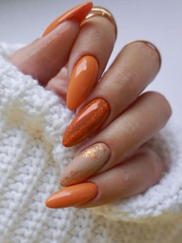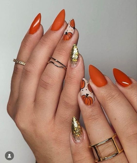 This design is all about sparkle and shine. With a base of rich pumpkin orange, the nails are topped with a layer of gold and copper glitter, mimicking the shimmering leaves of autumn. It’s a glamorous option for evening events and special occasions where you want to shine.