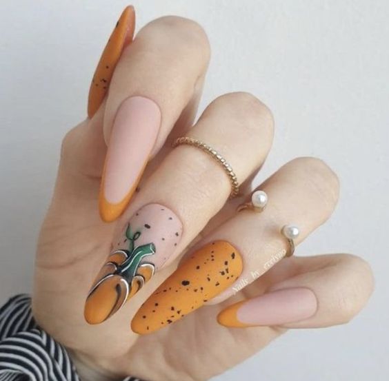 A bold and bright interpretation of pumpkin spice nails, this design features vivid orange polish paired with a nail art design that includes tiny pumpkins and playful polka dots. It’s perfect for seasonal parties or weekend outings where you want your style to shine brightly. The golden glitter on one nail adds a festive sparkle, making it a perfect match for both dressy and casual fall gatherings.
