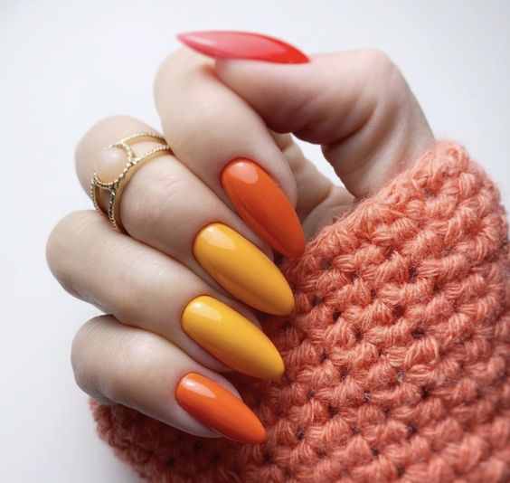 Subtlety meets style in this soft ombré design, which blends light peach into vibrant pumpkin orange. This look is enhanced by a unique twist: one nail features reverse ombré, adding an artistic touch that catches the eye. This style is particularly suited for those who appreciate a creative approach to traditional techniques.